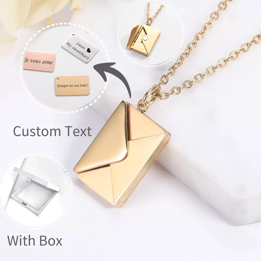 Descubre la magia de expresar tus sentimientos con nuestro Collar con colgante de sobre con letra de amor, una joya personalizada que combina elegancia y significado en un diseño único.